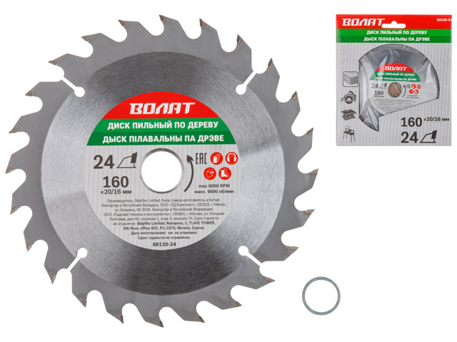 Диск пильный 160х20/16 мм 24 зуб. по дереву ВОЛАТ (твердоспл. зуб)