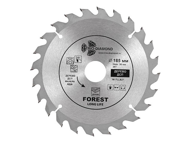 Диск пильный 185х30/20/16 мм 48 зубьев TRIO-DIAMOND Forest Long Life (FLL828) предназначен для распила древесины, ДСП, фанеры. Угол заточки 15 градусов. Максимальное число оборотов 8200 RPM.