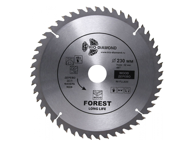 Диск пильный 185х30/20/16 мм 48 зубьев TRIO-DIAMOND Forest Long Life (FLL828) предназначен для распила древесины, ДСП, фанеры. Угол заточки 15 градусов. Максимальное число оборотов 8200 RPM.