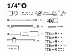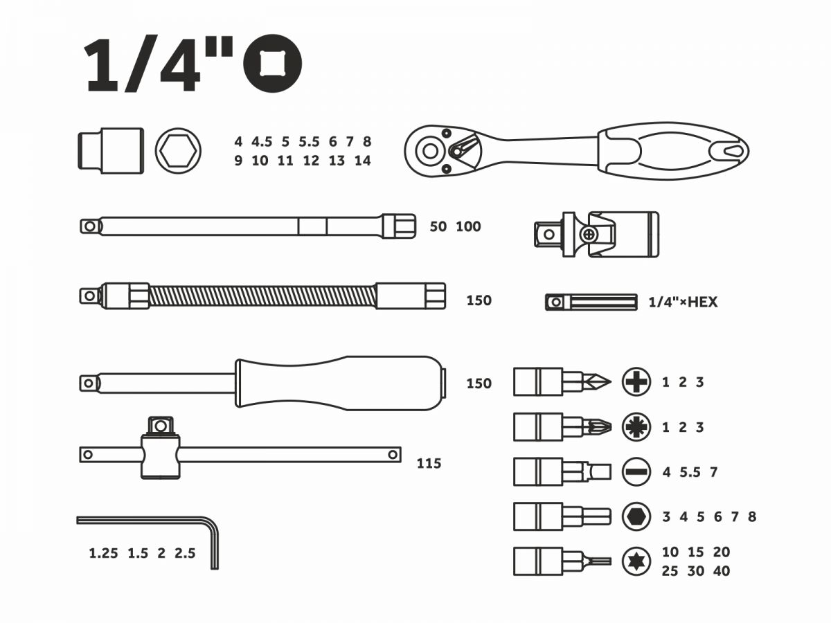 Головка торцевая 1/4": 4, 4.5, 5, 5.5, 6, 7, 8, 9, 10, 11, 12, 13, 14 мм;