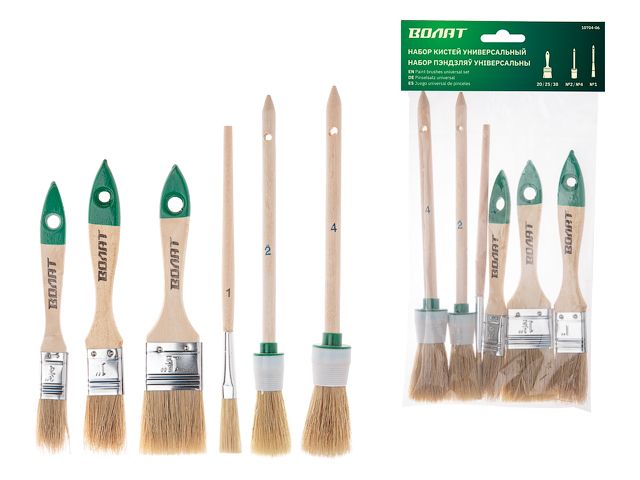 Набор кистей ВОЛАТ 6 предметов (10704-06) используется для малярных работ, нанесения лаков и масляных красок. Состав набора: плоские кисти 20 мм (3/4"), 25 мм (1"), 35 мм (1,5"), круглые №2, №4, корректирующая кисть №10. Тип щетины - натуральная светлая щетина.