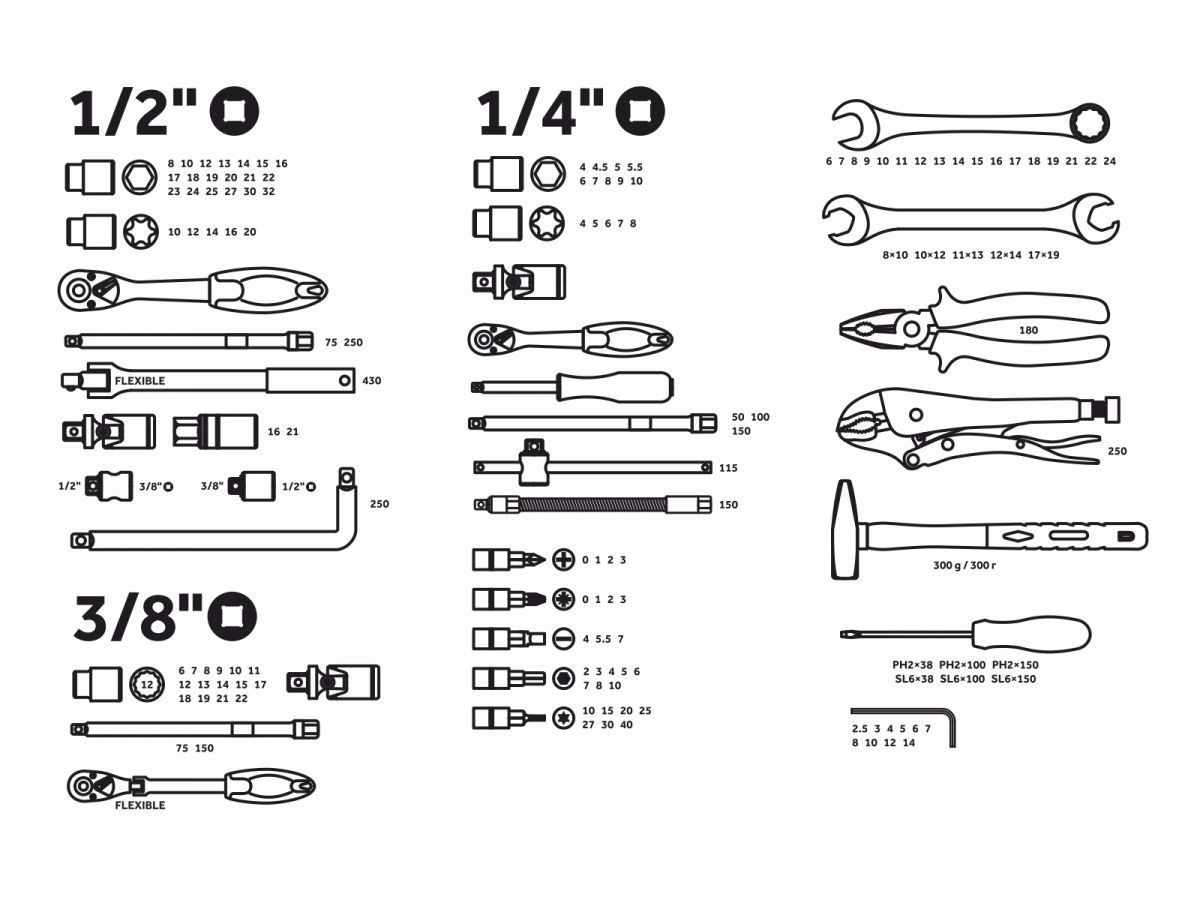 | Назначение | многофункциональный набор предназначен для ремонта и обслуживания автомобиля, а также для выполнения других слесарных работ |