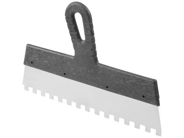 Шпатель зубчатый нержавеющий STARTUL Master 300 мм зуб 10 x 10 мм (ST1004-3001) широко используется при работе с кафельной плиткой и другими облицовочными материалами. Применение шпателя с зубчатой рабочей поверхностью обусловлено необходимостью в оптимальной толщине клеевого раствора, наносимого на облицовочный материал, что приводит к улучшению эффективности и качества облицовочных работ, позволяет экономить клеевой раствор. Выбор шпателя зависит от уровня кривизны стен – чем больше кривизна, тем большие по размерам зубцы должны быть. Изготавливается из нержавеющих сталей. Толщина рабочей поверхности составляет 0,5 мм.