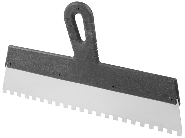 Шпатель фасадный STARTUL MASTER (ST1004-3508) основной инструмент при внутренней и внешней отделке помещений, представляет собой металлическую пластину прямоугольной формы с эргономичной пластиковой ручкой. Применяется при отделочных работах на больших площадях. Изготавливается из легированной стали для придания рабочей поверхности необходимой жесткости. Рабочая поверхность оснащена зубьями 8 х 8 мм для равномерного распределения смеси по обрабатываемой поверхности.